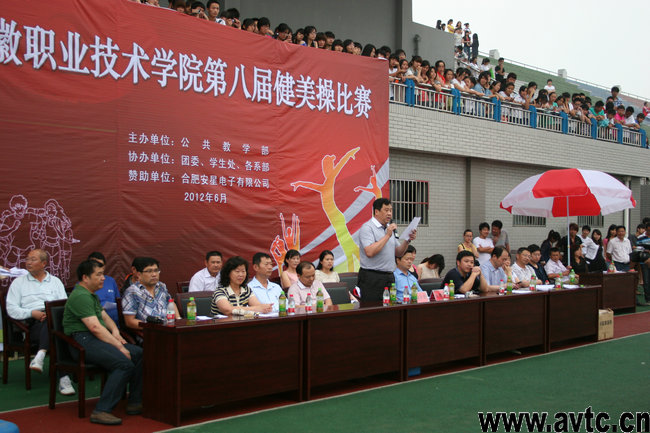 本网讯(宣传部 郝进平) 6月6日下午,由合肥安星电子有限公司冠名的安徽职业技术学院第八届健美操比赛在运动场举行。学院副院长李雪、合肥安星电子有限公司总经理赵金魁出席了开幕式,院党委宣传部、教务处、团委、保卫处等部门负责人和各系部党总支书记也参加了开幕式。安徽国际商务职业技术学院蔡红老师,安徽广播影视职业技术学院胡金萍老师,安徽省第十二届运动会健美操女子单人操冠军吴雨辰,国家一级健美操运动员、国家啦啦队队员、曾参加两届世界啦啦队锦标赛的何辰老师及学院全体体育教师在裁判长张小燕老师的带领下担任此次健美操比赛的评委。开幕式由公共教学部主任刘健主持。