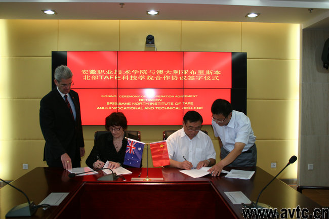 陈传海和傅礼陵分别代表安徽职业技术学院和澳大利亚北科技学院签署“教育合作协议”。今后我院将根据此协议招收酒店管理合作办学专业的学生,学术可以在我院同时学习中国和澳大利亚的课程,获得中国的专科文凭和澳大利亚的文凭,并可以在毕业后继续选择赴澳大利亚或英国等国留学深造。学院也可以通过与澳方的合作进行课程建设和教师培养,以提升学院的整体办学实力。