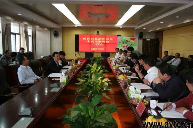 在汇报会上,学院院长陈传海代表全院师生员工向葛道凯一行莅临学院考察指导表示热烈欢迎。陈传海说,葛司长一行在百忙中抽时间来学院考察调研,充分体现了教育部领导对我院建设与发展工作的高度重视和亲切关心,全院上下深受鼓舞。接着,陈传海详细地向葛司长一行汇报了学院的基本情况和学院近年来改革与发展的主要举措与成果,并分别就学院推进专业服务产业能力建设、人才培养模式改革创新、课程体系构建和优化、师资队伍建设、实习实训基地建设、打造公共实训基地、教育教学管理体系建设、学生职业意识培养、创业培训服务等工作作专门汇报。