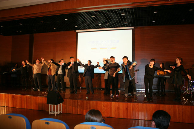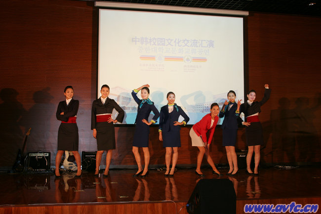 我院武术协会和民族风尚协会的学生进行了中国武术表演和汉服表演,学生的咏春拳、三节棍、剑术表演刚健有力,学生的汉服表演古朴典雅,中华传统文化的博大精深,深深地吸引了韩国师生。韩瑞大学航空观光系学生进行了航空礼仪表演,她们展示了各大航空公司的服装,风格各异、色彩鲜艳的服装以及学生们优美动人的身姿和舞台表演吸引了全场,迎来观众一片热烈的掌声,配有韩国“江南Style”潮歌的服装表演,把演出推向了一个高潮。韩瑞大学实用音乐系的师生也为大家带来了一阵阵的“韩国风”,实用音乐系学生还用中文和韩文演唱了周华建的《朋友》,在歌曲声中,观看演出的两校的领导们手拉手走上舞台,象征着友谊地久天长。最后,方徽聪书记和金镇宇院长等和参加演出的学生一起合影留念。