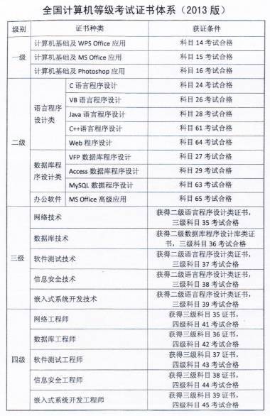 3、三级调整为“三级网络技术”、“数据库技术”、“软件测试技术”、“信息安全技术”、“嵌入式系统开发技术”五个科目,取消“三级PC技术”和“信息管理技术”,并要求必须通过二级相关证书后才可报名三级;