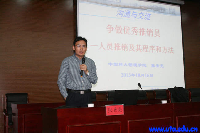 随后,中国科大管理学院MBA中心主任张圣亮教授做了题为“争做优秀推销员——人员推销及其程序和方法”的讲座。张圣亮兼任中国市场学会理事,安徽省商务厅、合肥市双凤工业区等顾问,安徽省国资委评审专家,国家自然科学基金、中国管理案例共享中心、《南开管理评论》、《管理学报》等评审专家,合肥电视台《新徽商》栏目点评嘉宾。张教授的演讲从人员推销及其基本形式、优秀推销员条件及其自我培养、上门推销程序和方法、柜台推销程序和方法等四个方面展开,内容丰富、通俗易懂,博得了台下阵阵掌声。讲座结束后,张教授与学生互动,回答学生的提问,现场气氛达到了高潮,首期讲座取得圆满成功。