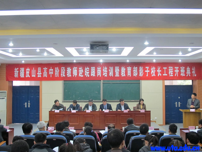 本网讯(教务处通讯员 杨林国) 11月11日上午,省教育厅新疆皮山县高中阶段教师赴皖跟岗培训开班典礼在合肥一中举行。省教育厅总督学李明阳、省教育厅相关处室负责人、皮山县副县长艾孜买提·阿不都热西提、合肥市教育局以及皮山县教育局领导和相关培训学院主要负责人参加开班典礼。学院院长亓四华应邀出席会议,并代表四所承担职业教育教师培训的院校致辞。