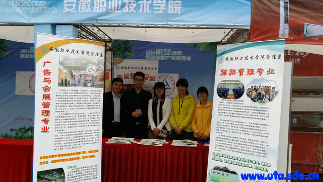 3月29日,伴着隐隐的雷声,在蒙蒙的春雨中,2014新安首届国际旅游产业博览会在安徽省金种子体育馆举行。为进一步宣传学院旅游管理、酒店管理、广告与会展专业,加强管理系学生与旅游市场的人才对接,我院管理系作为受邀单位,组织三个专业的学生和志愿者参加了本届旅游产业博览会,向参会的各旅行社、旅游景区等相关企业推介管理系专业和学生。