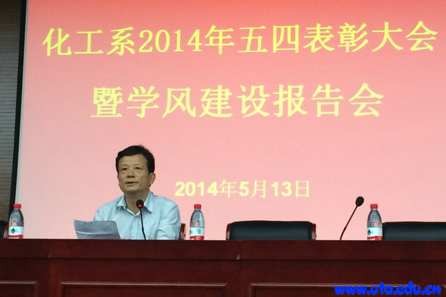 本网讯(化工系 戴晨伟)5月13日晚,化工系在图书馆三楼学术报告厅举行2014年学风建设报告会暨“五四”表彰大会,亓四华院长应邀在大会上作学风建设报告,会议由化工系副主任蒋成义主持。