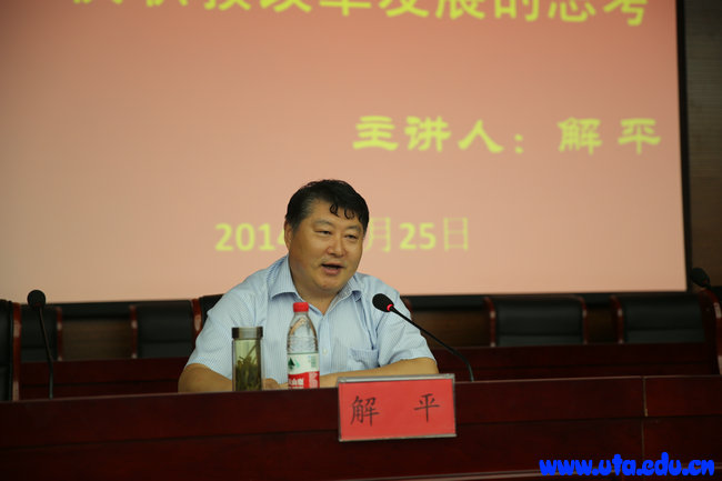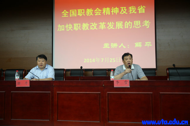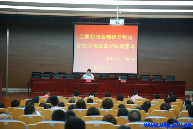 解平的报告一是分析了全国职教会议的精神,他从会议的特点、会议召开的经济社会及教育的背景、会议的主要精神等方面进行了讲解。二是带领大家领会习近平总书记的重要批示和李克强总理的讲话精神。三是解读了国务院《关于加快发展现代职业教育的决定》和教育部等六部门关于《现代职业教育体系建设规划(2014-2020年)》的主要精神、出台的新政策和新制度。