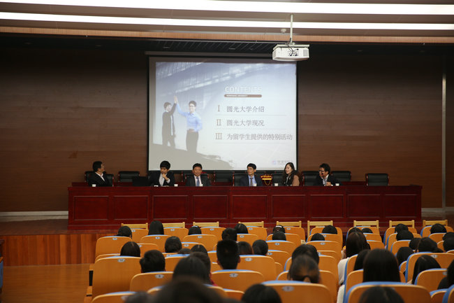 随后,圆光大学代表团在图书馆三楼报告厅为经贸系会计等专业的学生举办了留学说明会。圆光大学国际交流处的金泰亨老师给学生们介绍了赴韩留学的语言要求、专业选择、学费和生活费用、就业情况以及针对中国留学生的奖学金制度等学生关心的问题。