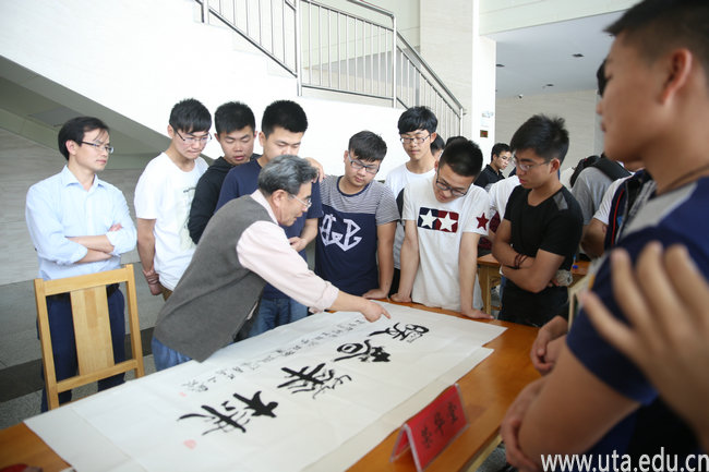 活动现场,书画家们各展所长,为广大师生即兴创作书画作品。荣华堂老先生写下“协手书画共绘青春”赠与书画协会的同学,并为同学们讲解书法创作要领;张仁斌老师现场指导同学进行书画创作。灵动飞翔的鸟儿、风姿绰约的墨梅跃然纸上,栩栩如生;“厚德载物”、“宁静致远”等书法作品遒劲有力,意蕴无穷。书画家创作的作品无论是内容还是内涵,都浸透着他们扎实而深厚的功力,让现场的师生们大开眼界。