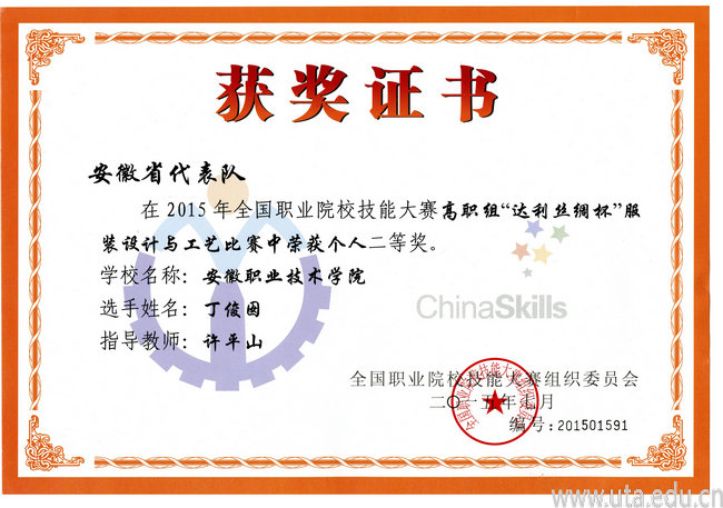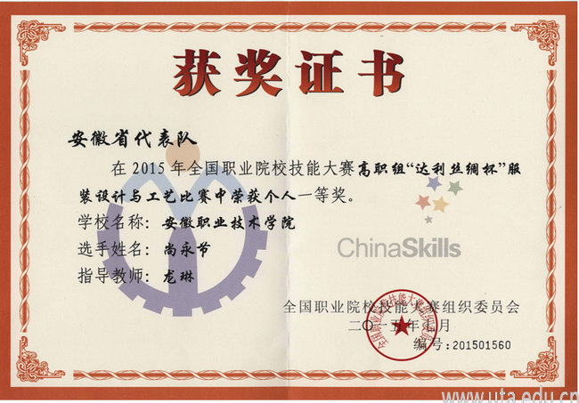 本次大赛由教育部主办,杭州职业技术学院承办,来自全国23个省市的158名选手参加了服装设计、服装制版与工艺两个赛项的角逐。此次比赛根据高职院校服装专业技能型人才培养的总体要求,结合现代服装企业科技发展与技术创新的人才需求,围绕服装设计创意、计算机绘图、服装立体造型与裁剪、服装工业制版、服装缝制与整烫等服装设计与工艺的核心技能,设计出针对服装设计和服装工艺技术两种岗位对应的知识、素质、技能竞赛内容。我院代表队在赛前刻苦训练,比赛中沉着应赛。最终,服装设计赛项的尚永节同学不负众望,一举夺得该项目的一等奖,同时获得“高级定制工”证书。服装工艺赛项的丁俊囡同学,以高昂的激情,精湛的技艺获得该项目的二等奖,同时获得“高级定制工”证书。龙琳老师获得“优秀指导老师”称号。