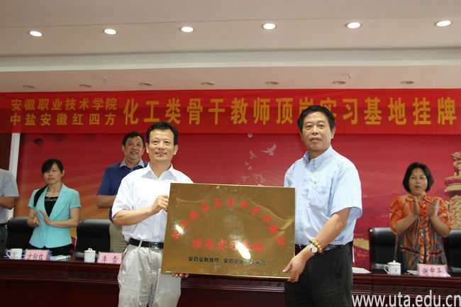 会见中,院长亓四华与中盐安徽红四方有限公司总经理方立贵签订了安徽职业技术学院与中盐安徽红四方有限公司共建教学实习基地协议,并为安徽职业技术学院化工类骨干教师顶岗实习中盐安徽红四方有限公司基地授牌。