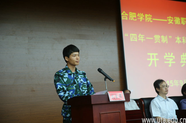 刘建中代表合肥学院发表致辞。他对我院的办学实力和办学条件给予充分肯定。他表示,在同学们的今后学习生活中,合肥学院将与安徽职业技术学院一起,竭力做好各项服务保障工作,努力为大家的成长成才搭建好新的平台。刘建中对同学们在新的学习生活方面提出三点要求。一要立德。做到立德修身,学会坚守做人处世的根本之道,要学会慎独慎微,常怀感恩之心;二要立学。做到勤奋学习,不断加强学习能力、独立思考、创新思维与科学精神的培养;三要立志。要坚定信念,做到从生活的自觉自主走向人生的自立自强。