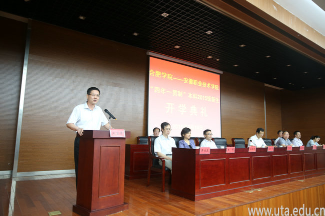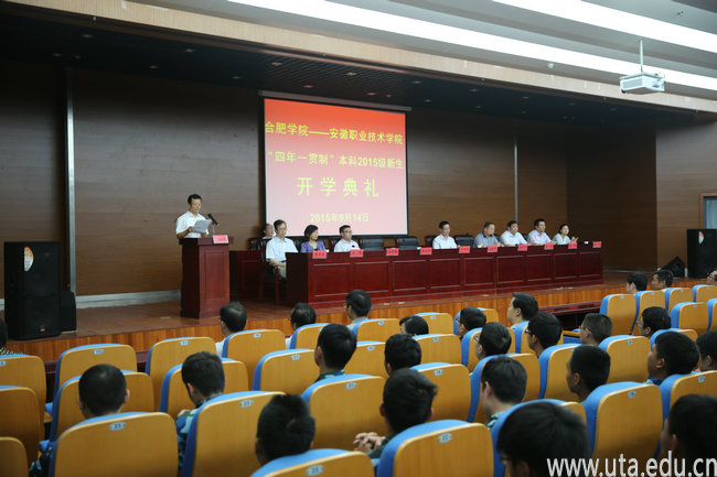 本网讯(教务处通讯员 张晓露)9月14日,学院在图文信息中心三楼学术报告厅举行2015级合肥学院—安徽职业技术学院“四年一贯制”本科新生开学典礼。学院院长亓四华、副院长徐才华、党委副书记徐振轩、副院长李雪、副院长史锋、副院长陈行、纪委书记蒋永忠以及相关部门负责人、全体2015级本科新生出席开学典礼。合肥学院副院长刘建中、学生处长董承军、招生办胡萍老师应邀出席典礼。徐才华主持开学典礼。