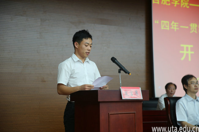 开学典礼在国歌声中拉开序幕。亓四华首先致欢迎辞。亓四华对学院2015级“四年一贯制”本科新生表示热烈欢迎。他在对学院基本情况、办学特色以及“四年一贯制”技术技能型本科人才培养进行介绍后,对本科新生提出了四点希望。他希望大家要登高临远,规划人生,要牢牢把握人生的正确航向,把个人的理想、人生的规划、自身的成长融入祖国、人民和社会的伟大事业之中,胸怀报国之心,树立鸿鹄之志;既仰望星空,又脚踏实地,用勤奋努力、务实创新来书写壮丽的青春乐章。二要确立自我,学会独立。要懂得反思,在反思总结中更好认识自我、认识他人、认识社会,不断追问生命的意义;要学会坚守,坚定自己的理想追求,始终保持对未知的好奇、对真理的渴望;要坚持做人的原则和崇高的理想、信念;要寻找自信,克服失败的迷茫,从挫败中学习,建立起自己的人生自信。三要学会学习,勇攀高峰。要学会用已学过的知识去学习新的知识,学会用已学过的知识去解决所遇到的问题;学会用已学过的知识去创新知识,逐渐提高;要善于研究,善于发现新问题,不断提高自己的实践能力、创新意识和综合素质。四要健全人格,崇德修身。在校期间,要加强道德修养,注重陶冶情操,强化品行修炼,做一个有理想、有才华、有品格、有责任的人,做一个思想健康向上、视域深邃广阔、身心洁净无暇、具有社会主义核心价值观和良好公民行为规范的现代大学生。