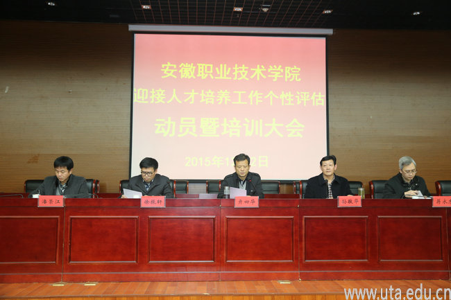 孙敬华院长作评估动员讲话。他指出,安徽省教育厅对我院开展人才评估工作个性评估是对我院办学水平和办学能力的一次全面检阅,是关系到学院生存和发展的全局性工作,对有效指导和引领我院评建工作将起到重要作用。为圆满完成本次人才评估工作,他提出五点意见:一是统一思想,提高认识。人才评估是我院自身发展的必然要求,学院全体教职员工应以评估为契机、为动力、为载体,充分发挥评估的评价功能、鉴定功能、自省功能、导向功能和督促功能。学院所有工作都是评估的内容,每个人都是评估的对象,全院教职员工要把思想和行动统一到评估指标体系的内涵上来,统一到学院的具体要求和部署上来。二是深入宣传,广泛发动。全体教职工要理解评估指标内涵,领会评估要求,掌握评估的方法,充分了解现代职业教育改革发展思想、理念、原则和方法,特别要在办学指导方针等十个方面准确把握。要广泛发动,全员参与。要重点处理好个性评估与日常工作、个性评估与高水平大学建设、硬件建设和软件建设、重点建设与全面改进、整改与完善、一般号召与个别指导等六个方面的“关系”。他希望全院各级领导和师生员工必须以高度的责任心、饱满的热情、务实的态度投身到“迎评”工作中去,全院上下形成“人人关心评估,人人参与评估,人人奉献评估”的迎评氛围,形成团结一心,众志成城,全力以赴的工作局面,在全校掀起评建的工作热潮。三是明确目标,科学谋划。学院各级各部门要按照《方案》要求,紧紧围绕“五个度”的文件精神,认真组织实施,全力以赴做好评建的各项准备工作。四是细化责任,狠抓落实。要细化任务,明确责任,把任务落实到具体部门,各部门要按照学院《评建方案》要求,拟定部门的具体工作计划,对任务再进行进一步分解,把具体工作任务落实到具体人员,做到“层层分解、任务具体、责任明确”;要完善机制,狠抓落实。这次评估要实行 “一把手”负责制等六项责任制,强化和落实责任,加强对评建工作任务落实情况与完成质量的督查,保障评估的顺利进行。五是坚定信心,志在必得。本次评估工作是对全院干部教师队伍的又一次全新考验。因此,全体教职工一定要振奋精神,坚定信心,以服务大局、高度负责、甘于奉献的精神;以齐心协力、同舟共济、团结合作的精神;以积极进取、奋发向上、敢为人先的精神,努力做好评估的各项工作,努力完成评估的各项任务。