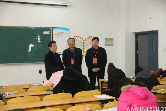 本网讯(教务处通讯员 张文徽)12月19日,2015年下半年全国大学英语等级考试开考,省教育纪律检查工作委员会书记、省委教育工委委员王光虎在教育厅财务处强少华同志的陪同下来我院考点巡视。院领导亓四华、孙敬华、史锋、蒋永忠陪同王光虎一行巡查考场及考试安排情况。