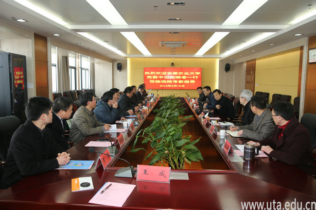 本网讯(院办通讯员 郝进平)3月13日,安徽农业大学党委书记宛晓春、副校长马传喜及安徽涉外经济职业学院董事长王叙平等一行13人来我院考察交流。院党委书记亓四华、副院长陈行、纪委书记蒋永忠热情接待了来宾。学院相关部门负责人参加座谈交流。