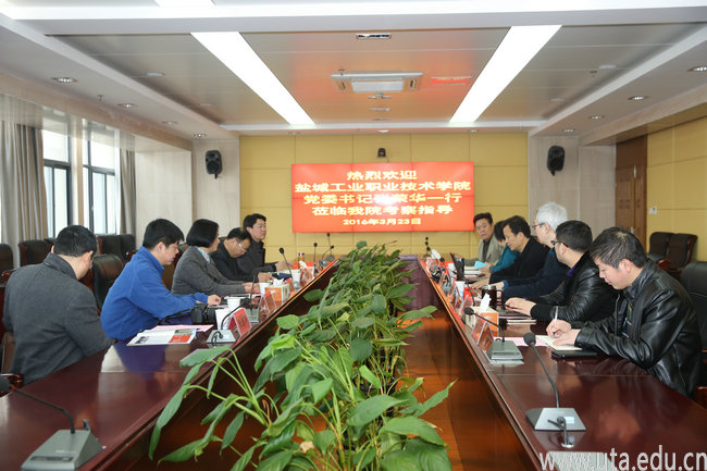 本网讯(办公室通讯员 郝进平)3月24日,盐城工业职业技术学院党委书记张荣华、纪委书记董顺锋一行5人来我院考察交流。院党委书记亓四华、纪委书记蒋永忠热情接待了客人,学院相关部门负责人参加了接待。