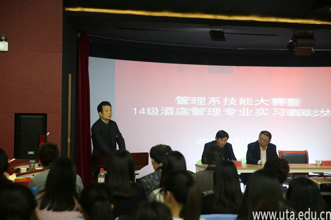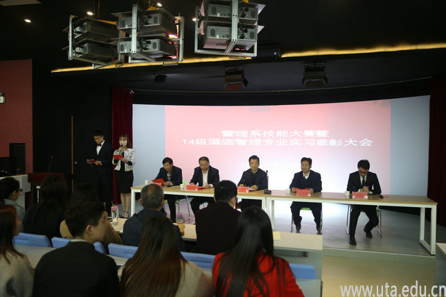 本网讯(管理系通讯员 韩玮玮)3月30日,学院管理系召开技能大赛暨优秀实习生表彰大会。学院党委书记亓四华,管理系主任王培俊、党总支书记吴自强、副主任张祎及管理系全体教师、辅导员,管理系酒店管理专业、旅游管理专业及文秘专业部分学生参加大会。无锡灵山元一希尔顿逸林酒店人力资源总监邵啸川应邀出席表彰大会。