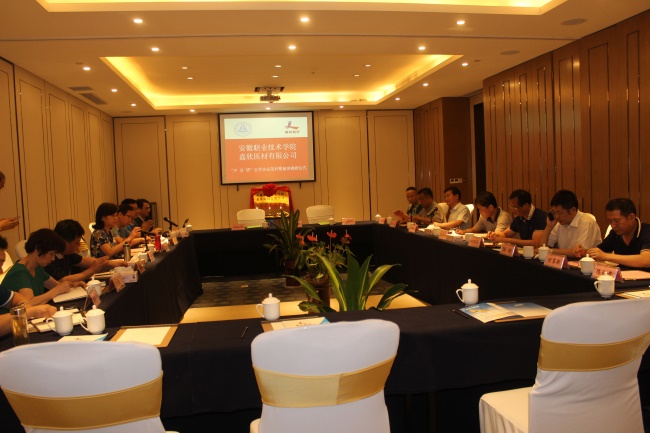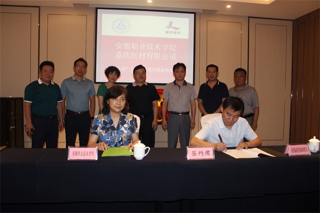 本网讯(办公室通讯员 陈晓春)安徽职业技术学院与安庆市嘉欣医疗用品有限公司“产学研”合作协议签约暨基地揭牌仪式于2016年8月11日在安庆举行。安徽省经信委办公室主任程英春、安庆市经信委副主任陈雅爱、安庆市经信委投资办主任赵晓东、安庆市宜秀区政府副区长江学文、宜秀区工信委主任陆超、安庆市嘉欣医疗用品有限公司董事长汪秀春、总经理王敬良,学院副院长史锋及相关学院、部门负责人及部分教师等出席了仪式。仪式由安庆市嘉欣医疗用品有限公司总经理王敬良先生主持。