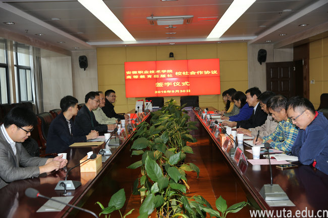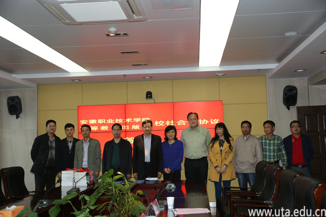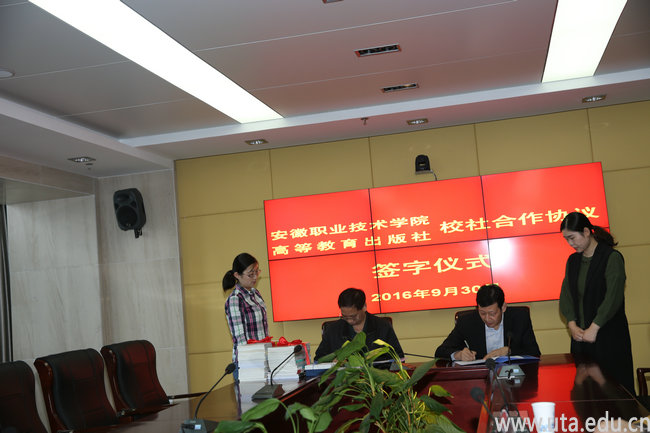 本网讯(教务处通讯员 张晓露)9月30日上午,学院与高等教育出版社在校图文信息中心9楼会议室举行了校社合作签字仪式。学院校长孙敬华、副校长史锋、学院相关部门负责人以及高等教育出版社高职事业部主任徐刚、副主任王冰、华东区经理鲁巍、安徽教学服务中心副主任徐海洋等参加仪式。