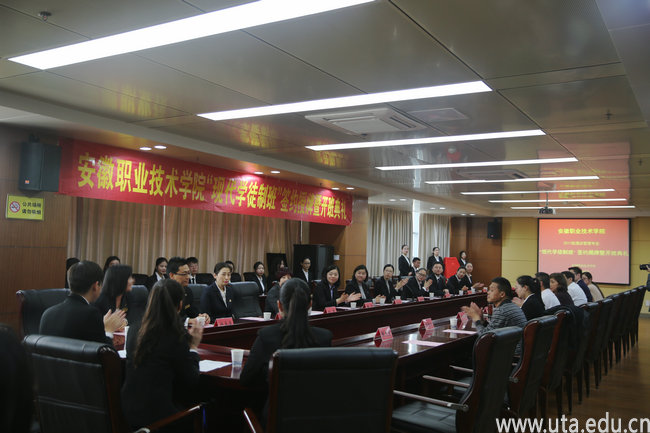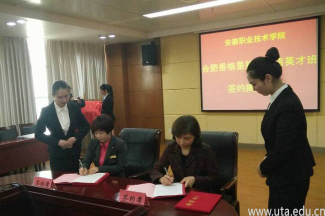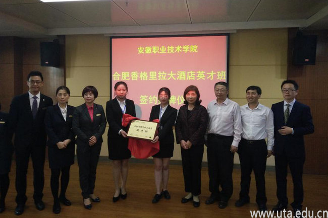 本网讯(管理学院通讯员 孙辉)4月11日下午,我校2017级酒店管理专业现代学徒制班签约、揭牌暨开班典礼在图文信息中心十楼会议室隆重举行。副校长史锋、管理学院院长王培俊、党总支书记吴自强、酒店管理教研室主任王家祥以及香格里拉国际酒店集团(合肥区)、法国雅高酒店管理集团(合肥酒店群)、碧桂园凤凰国际酒店管理集团(第五区)三家企业负责人出席了典礼。典礼由王培俊主持。