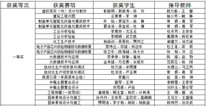 2018年安徽省高职院校技能大赛我校一等奖获奖情况一览表