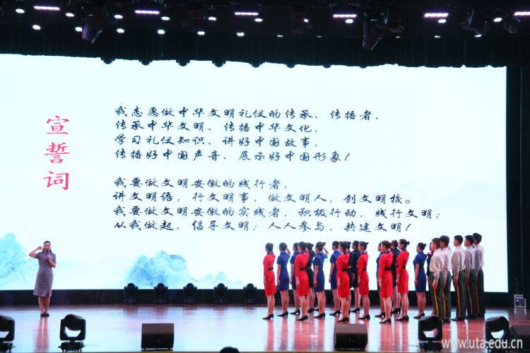 仪式上,蔡少惠宣读《中华礼仪公益万里行倡议书》,并对学院积极响应弘扬中华礼仪公益万里行活动给予充分肯定,希望学院以此次活动开展为契机,进一步弘扬中华优秀传统文化,为社会培养更多德智体美劳全面发展的人才。随后,中华礼仪公益讲师团成员徐李莉带领全体师生进行“弘扬中华礼仪公益万里行”宣誓,学院礼仪队、朗诵队分别进行礼仪创编操展示和国学经典诵读。