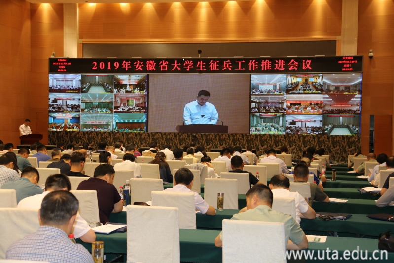 本网讯(保卫处通讯员 王胜璋)5月29日,2019年安徽省大学生征兵工作推进会在安徽省军区召开。全省各高校、各兵役机关负责人参加会议。安徽省教育厅副厅长解平,省征兵领导小组副组长、省军区副司令员徐继龙到会讲话。我校副校长陈行代表学院做题为《在“五个到位”上凝心聚力精准发力为部队输送优质兵员》经验交流发言。