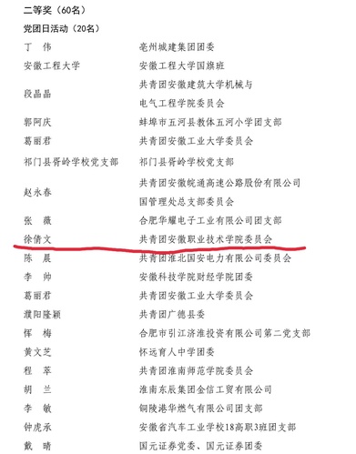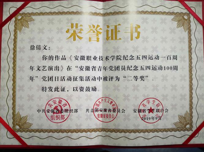 为深入学习贯彻习近平新时代中国特色社会主义思想和党的十九大精神,大力弘扬五四精神,5月13日省委组织部、团省委、省学联在全省联合开展纪念“五四运动100周年红色信息征集评选活动”。历时三个月的活动于7月圆满结束,9月评选结果揭晓,我院团委宣传部徐倩文同学投稿的作品《安徽职业技术学院纪念五四运动一百周年文艺演出》在活动中荣获二等奖。