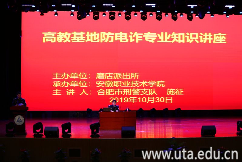 本网讯(保卫处通讯员 王胜璋)10月30日下午,由磨店派出所主办,安徽职业技术学院承办的“高教基地防电信诈骗专业知识讲座”在我校大学生活动中心进行,来自高教基地17所学院的辅导员(班主任)、保卫干部、学生管理人员共500多人参加了本次培训,磨店社区综治办领导也亲临现场。培训由磨店派出所所长蒯家球主持,主讲人是合肥市刑警支队干警施征。