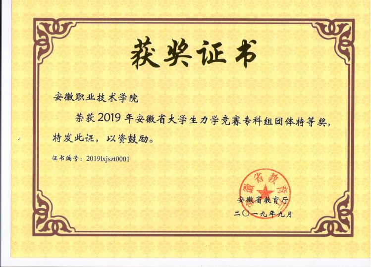 本网讯(机械工程学院通讯员 胡伟)在今年5月份举行的2019年安徽省大学生力学竞赛(专科组)中,我校学子荣获个人特等奖2项,一等奖4项,二等奖9项,三等奖7项,并以团体总分第一的成绩荣获团体特等奖,以良好的赛前组织工作荣膺优秀组织奖。