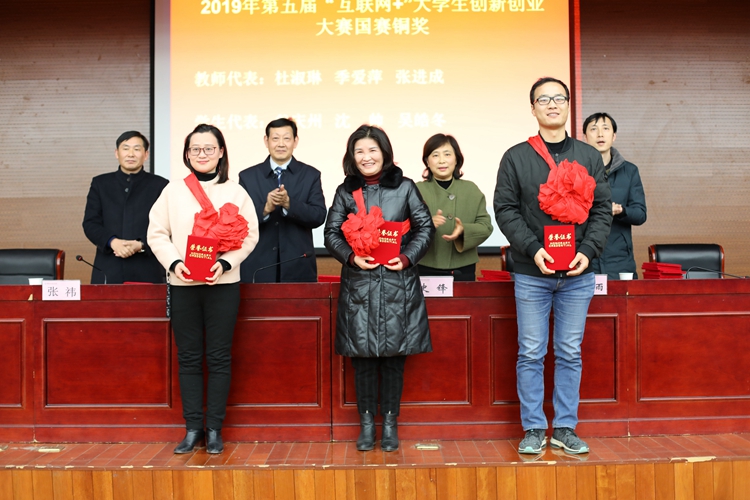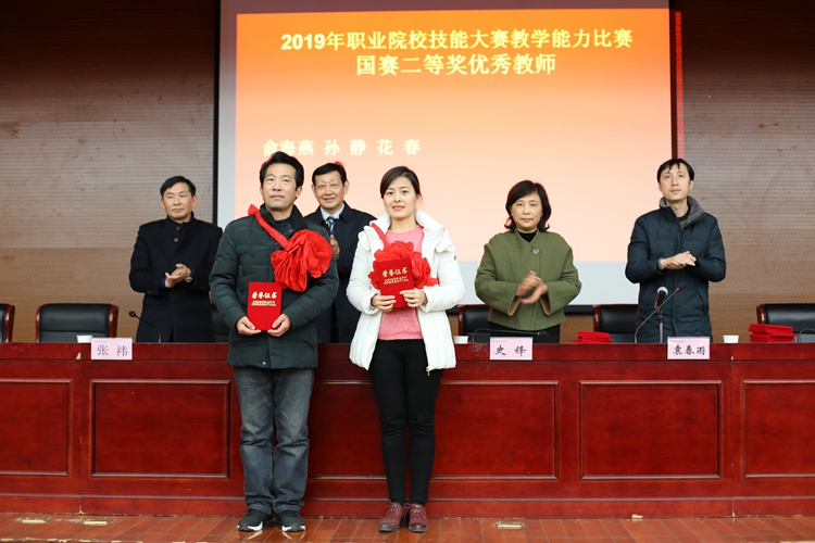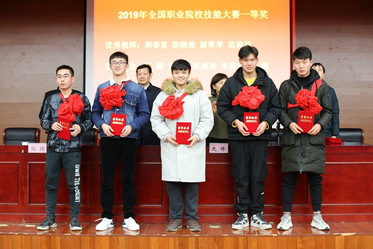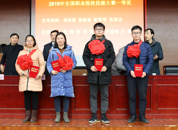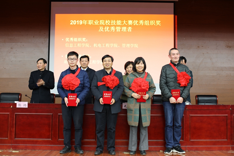 会上,史锋宣读了表彰文件,授予胡春雷等126名教师“2019年职业院校技能大赛优秀教师”称号,授予张璐等239名同学“2019年职业院校技能大赛优秀学生”称号,授予陈晓晨等43名教师“2019年第五届‘互联网+’大学生创新创业大赛优秀教师”称号,授予曹慧等121名同学“2019年第五届‘互联网+’大学生创新创业大赛优秀学生”称号,授予俞海燕等28名教师“2019年职业院校技能大赛教学能力比赛优秀教师”称号。信息工程学院等3个院部荣获“2019年职业院校技能大赛优秀组织奖”,信息工程学院教师胡春雷荣获“优秀管理者奖”。在热烈喜庆的氛围中,校领导为获奖师生代表颁发荣誉证书。