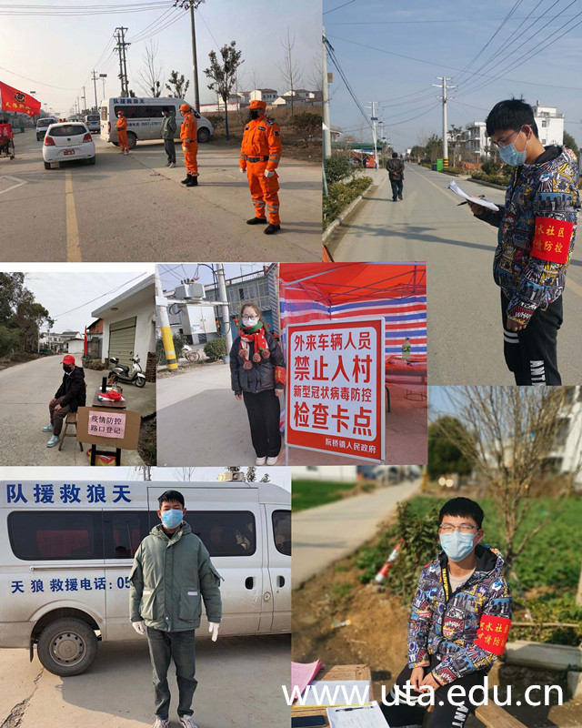 各二级学院的志愿者在各地政府、有关部门的统一指挥下,参与疫情联防联控工作,他们有的奔赴基层,在所在地区宣传防疫知识、协助信息登记工作;有的坚守在疫情防控点,耐心执勤测量行体温、监控进出车辆;有的为防疫前线的工作人员保障后勤工作。100多位志愿者放弃了与家人在家休息的机会,毅然选择了外出抗疫,用青春热血守护父老乡亲的健康,展现出了安职学子勇挑重担、迎难而上的担当精神。