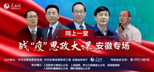 本次“同上一堂战‘疫’思政大课”安徽专场,邀请了时代楷模、大连海事大学马克思主义学院教授、教育部思想道德修养与法律基础课教学指导委员会副主任委员曲建武,安徽援鄂抗疫医疗队总领队、安徽省血吸虫病防治研究所所长、主任医师汪天平,安徽中医药大学马克思主义学院院长、教授董玉节,合肥师范学院副院长、教授姚本先,中共安徽省委党校(安徽行政学院)马克思主义学院院长、教授汪兴福,作为主讲嘉宾。他们结合疫情防控,讲述战“疫”一线的感人故事,分析疫情防控过程中彰显出的中国共产党领导和中国特色社会主义制度的显著优势,引导广大青年学生正确认识和看待此次战“疫”,树立责任担当意识,激发爱党爱国爱社会主义深厚情怀。