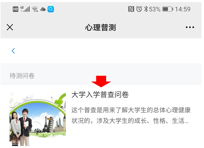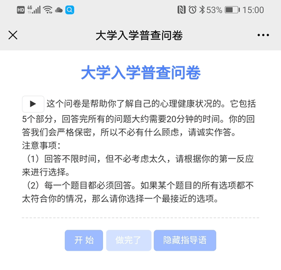 为深入贯彻落实教育部(教思政厅函[2021]10号)、省教育厅《关于做好2021秋季学期高校学生心理健康教育工作的通知》文件精神,全面掌握学生心理健康状况,增强学生心理健康意识,不断提高我校大学生心理育人水平。现决定于2021年9月23日至9月29日开展2021级全体新生心理普查工作,请各二级学院接此通知后,及时安排本院新生按时参加测试。