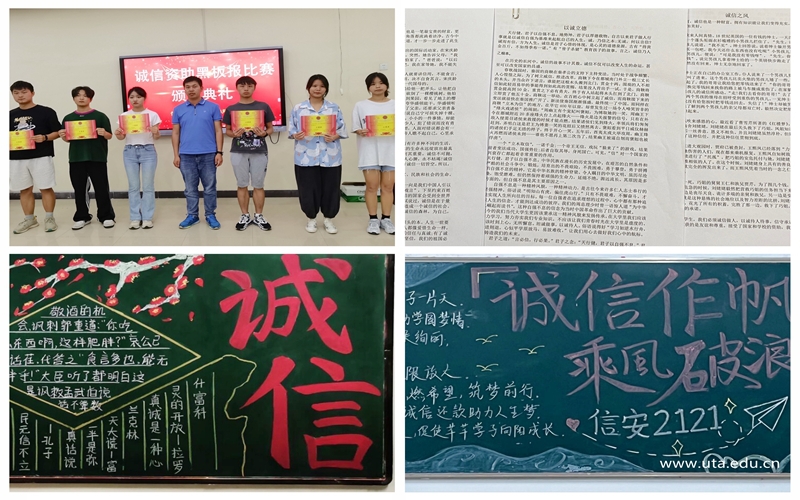 比知识,书励志——开展“诚信为本、立德修身”主题征文与板报评比活动。征文比赛以“诚信为本、立德修身”为主题,参赛选手结合实际,讲述了自己或身边人接受国家资助,感恩励志、自强不息的拼搏故事。经过评选,共有20余篇优秀征文进入院级决赛。资助政策宣传黑板报评比,各班积极宣传、集思广益、认真研究国家资助体系及政策,精心创作,勇于创新,内容丰富且富有内涵,学生参与度高、影响力大,成效显著。学生在作品创作的过程中,进一步明白了诚信与奉献的意义,懂得了热爱祖国、奉献社会、诚信做人。