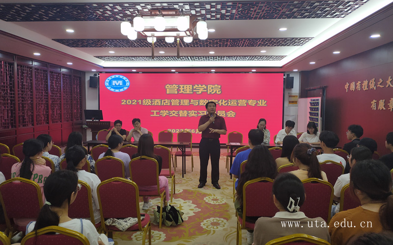 6月10日上午,管理学院在经管楼509多功能宴会厅实训室召开2021级酒店管理与数字化运营专业工学交替实习动员会。管理学院院长刘玉杰、酒店专业教师、辅导员、老生代表和2021级酒店专业全体同学参加了会议,会议由酒店管理教研室主任孙辉主持。