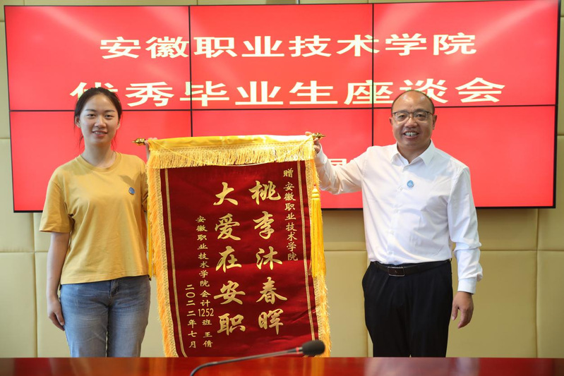 杰出校友代表、“安徽好人”王倩赠予学院锦旗“桃李沐春晖,大爱在安职”,以此表达对母校的感恩之情。