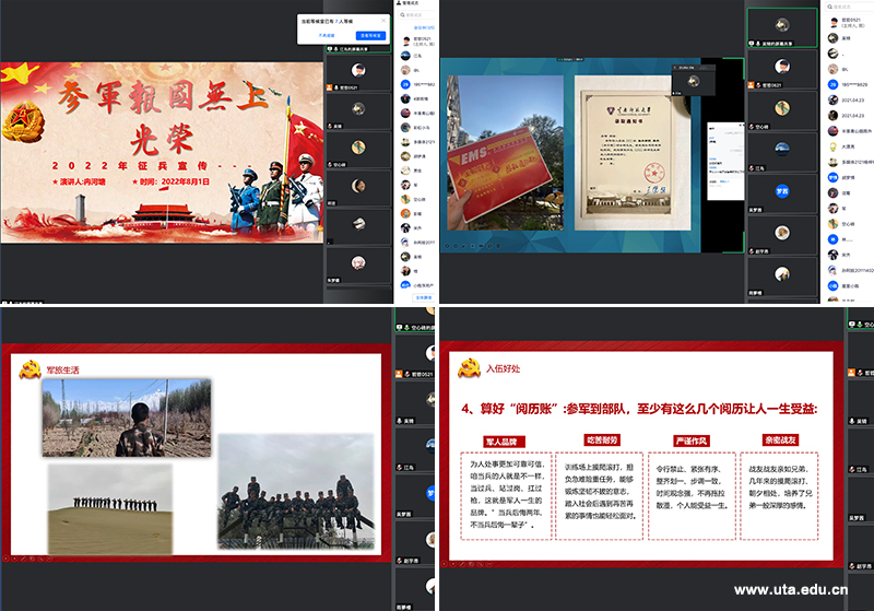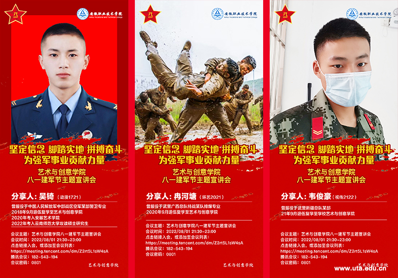 95载峥嵘岁月,95载岁月如歌,为庆祝中国人民解放军建军95周年,青年大学生思想政治引领,在青年学生群体中营造尊重尊崇军人军属、退役军人的浓厚氛围,进一步激发青年大学生应征入伍热情,艺术与创意学院于8月1日晚邀请本学院3名优秀退伍学生代表在线上开展“八一”建军节主题宣讲,学院教师代表及近两百名青年学生聆听了宣讲报告。