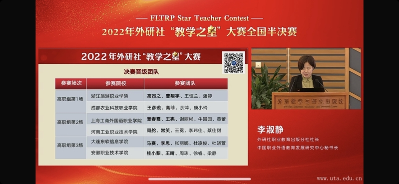 本网讯(外国语学院通讯员 冷慧勤)8月3日至4日,全国高等职业学校英语教学发展与创新研修班暨外研社“教学之星”大赛全国半决赛(高职组)云端成功举办。由安徽职业技术学院外国语学院教师桂小黎、王晴、周玮、徐睿、梁静组成的参赛团队,荣获全国半决赛特等奖,成为安徽省首次晋级全国总决赛的团队,实现了安徽省“零”的突破。