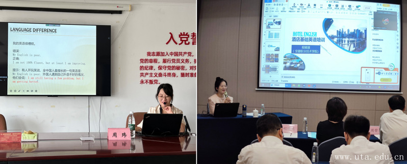 为进一步推进、落实产教融合研究项目部署,825日,外国语学院赴安徽海外旅游有限公司、安徽饭店开展线上线下校企合作培训活动,主题分别是《旅游接待情境下的跨文化交际能力培训》和《酒店基础英语培训》。外国语学院副院长胡菁蕾带队,外国语学院教师周玮和程晓慧授课。