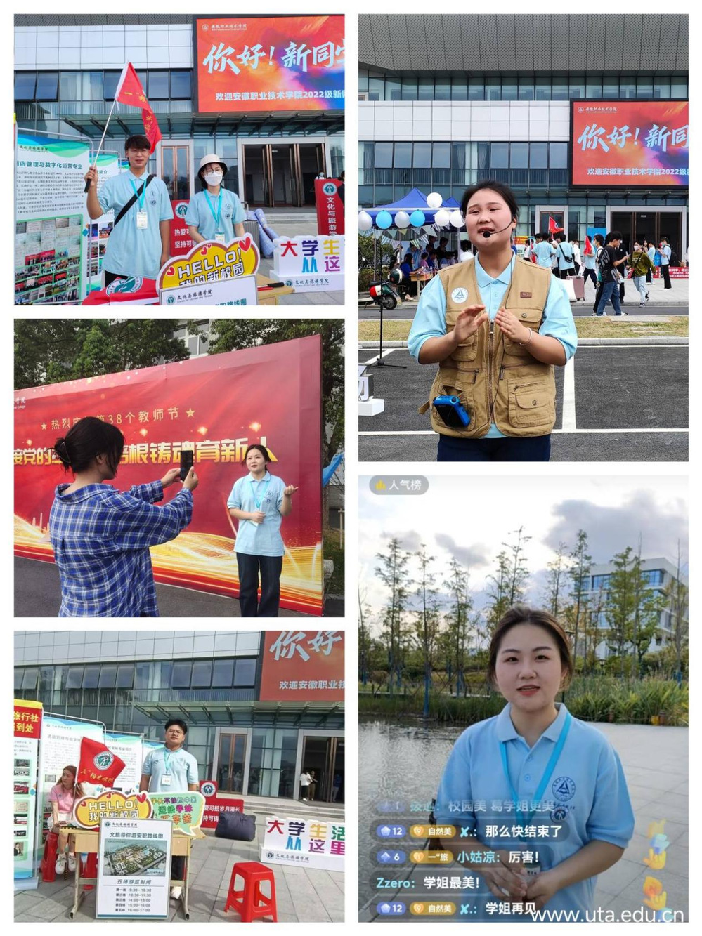 迎新期间还与学院官方抖音账号联动,进行了“云游安职”校园直播活动,现场报道校园迎新实况,让不能来校的家长们放心、安心。