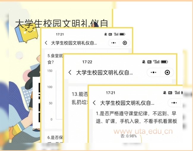 团总支学生会自主设计调查表,指导全院师生礼仪自检。有同学表示,礼仪自检,其本身就是一种礼仪修养。