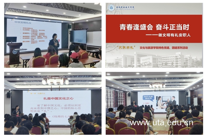 学院礼仪宣讲队在经管楼5楼宴会厅举办《青春逢盛会奋斗正当时——做文明有礼安职人》讲座,讲座由学院礼仪宣讲队成员、党总支副书记徐李莉主讲,文旅学院全体学生干部、新生代表参会学习。徐李莉从仪容之礼、服饰之礼、言谈之礼和举止之礼四个方面向同学们生动讲解了什么是礼,为什么要讲礼仪,怎样践行校园文明礼仪。讲座以讲促学、以学促用,让学生深刻领会了中华文明礼仪魅力。讲座内容也在潜移默化之中让礼仪知识入耳、入脑、入心,引领青年学子以实际行动投身文明校园建设。