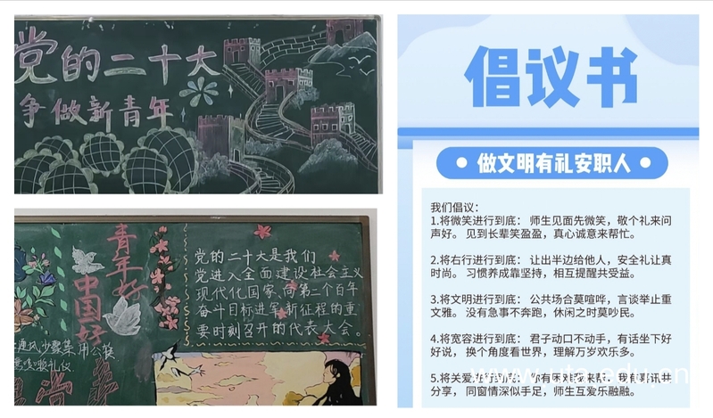 学院团总支学生会向全体师生发出“做文明有礼安职人”倡议书。各班级团支部利用黑板报、微信群、QQ 群等载体,开展形式多样、内容新颖的“微倡议”活动,形成全员响应的良好效果。