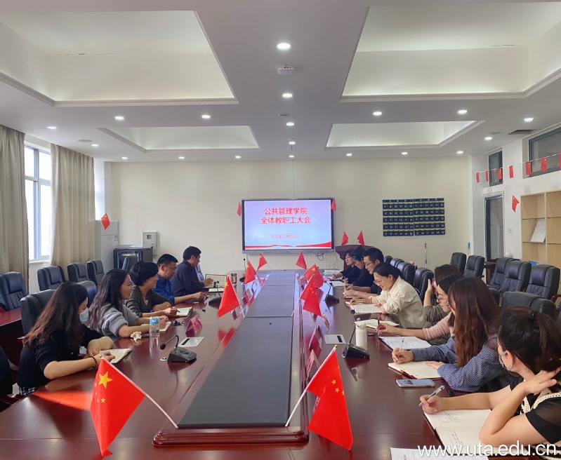 11月10日,公共管理学院召开教职工大会,传达相关会议精神,落实相关工作部署,学院党总支副书记闫冰,副院长张祎、杨珍和全体教职工参加会议。会议由闫冰主持。