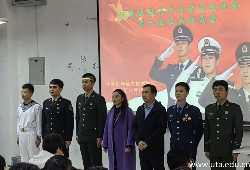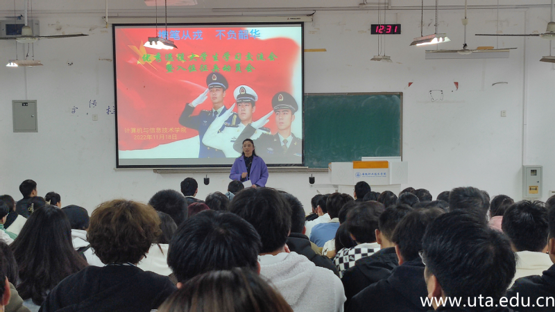为深入学习贯彻党的二十大精神,引导广大青年坚定不移听党话、跟党走,立志做有理想、敢担当、能吃苦、肯奋斗的新时代好学生,11月18日中午,计算机与信息技术学院在电教103室召开“携笔从戎、不负韶华”——优秀退役大学生学习交流会暨入伍征兵动员会,学院党总支负责人王丹参加交流会并讲话,计信学院软件网络党支部全体党员、学院2022级新生代表、2020级有意向入伍的同学共150余人参加交流会,会议由软件网络党支部书记张剑桥主持。