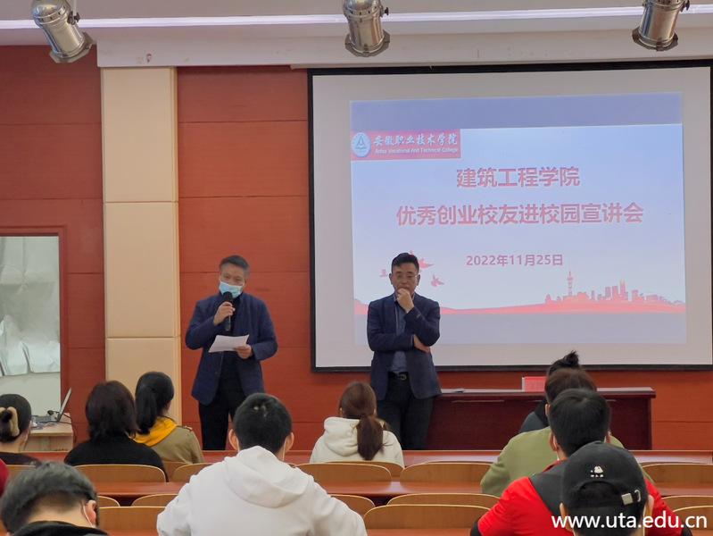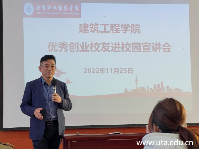 为深入贯彻党中央、国务院和省委、省政府“稳就业”“保就业”决策部署,推动大众创业、万众创新走深走实,激发大学生群体的创业热情,促进大学生更加充分更高质量就业,11月25日,建筑工程学院在教A附楼举办“优秀创业校友进校园宣讲会”。本次宣讲会主讲人为学院1992届优秀毕业生,合肥格林工程材料有限公司总经理王国庆。建筑工程学院党总支书记陈传胜、副院长蒋庆华、毕业班辅导员及2023届毕业生参加会议。