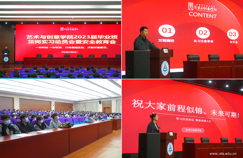为统筹做好2023届毕业班学生离校及顶岗实习工作,11月25日晚,艺术与创意学院在图文信息中心三楼报告厅召开2023届毕业班顶岗实习动员会暨安全主题教育会,学院党总支负责人杨哲,毕业班辅导员代表贾佳、徐运华、周经波及全体毕业班学生参加此次会议。会议由杨哲主持。