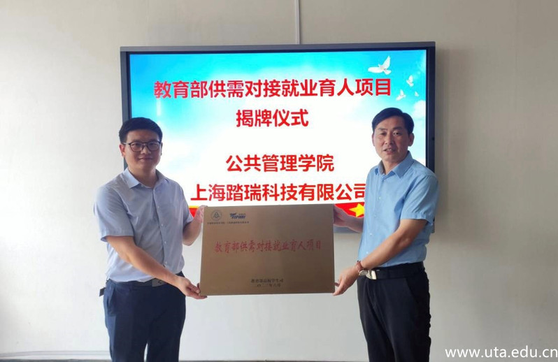 9月6日,公共管理学院与上海踏瑞科技有限公司“教育部供需对接就业育人”项目授牌仪式顺利举行,学院党总支书记闫冰、院长张祎、副院长杨珍,人力资源管理教研室主任刘玲玉,校企合作单位上海踏瑞科技有限公司孙念星经理共同出席此次仪式。仪式上,双方互授“就业实习基地”“定向人才培养项目”牌匾。